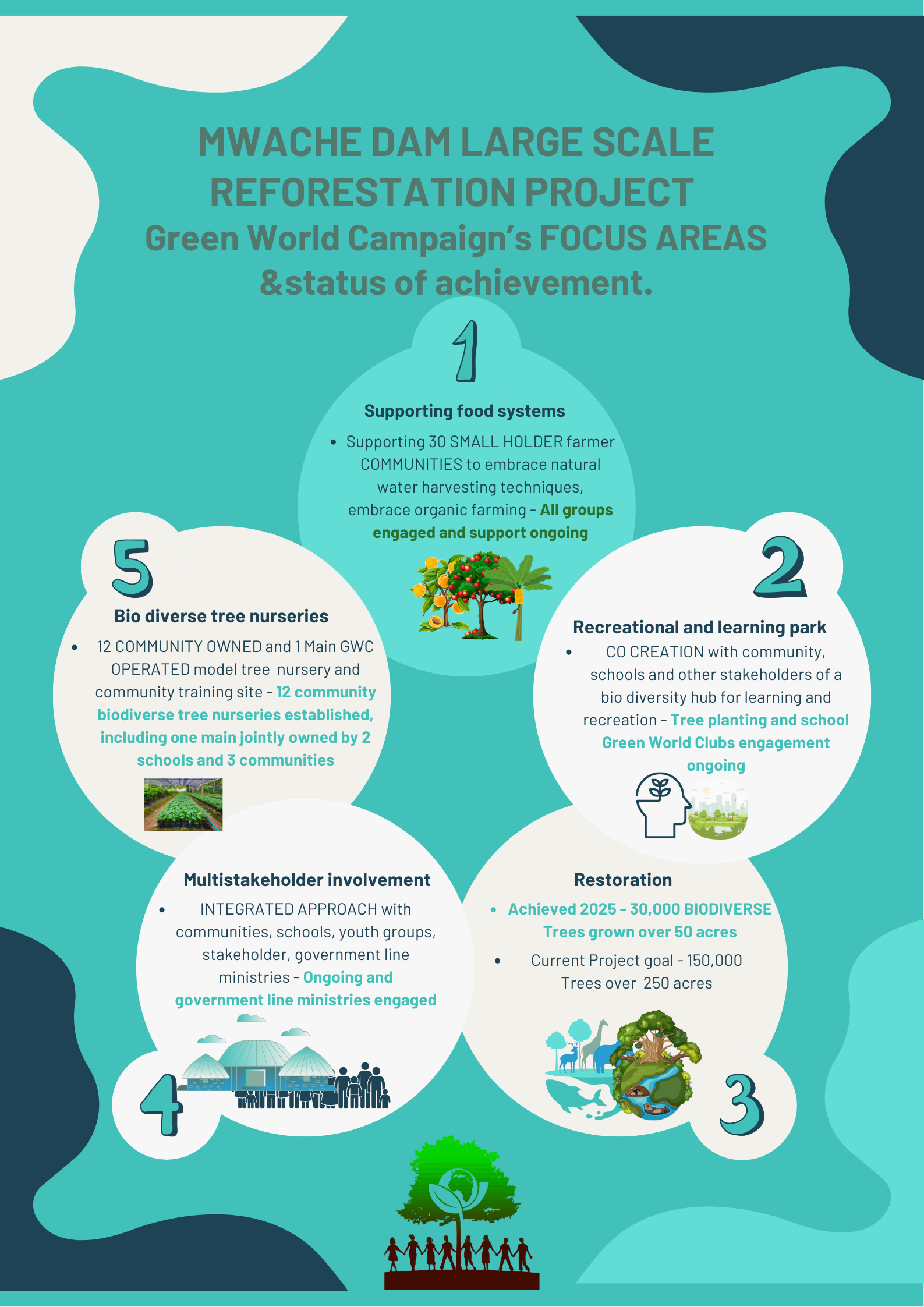The Mwache Multipurpose Dam project has entrusted GWC with 50 acres of community land to develop the Green World Campaign Park, a dedicated area for reforestation and afforestation. Our primary objective is to plant indigenous trees that will rejuvenate the local ecosystem. The project strongly emphasizes community involvement, which is essential for ensuring the high survival rate of these newly planted trees. Additionally, we will address the region's drought challenges by implementing innovative water catchment systems that leverage a nearby stream to support the growth of the forest.